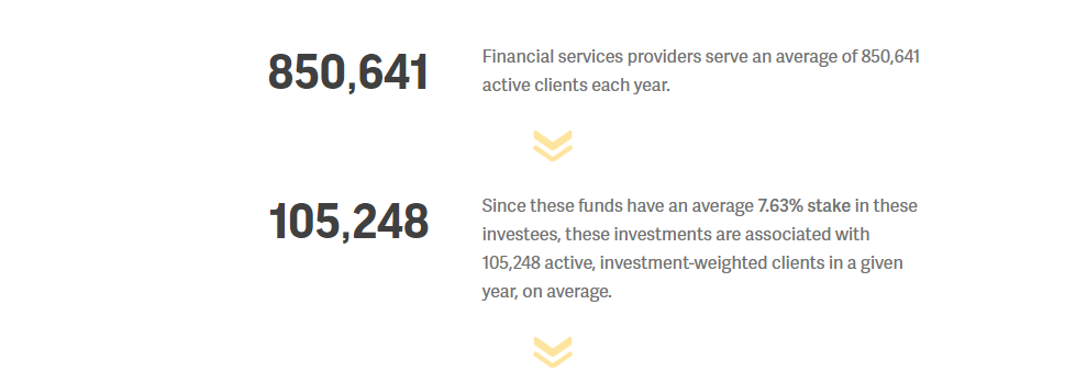 - Investment-weighted figure: This reflects the normalized (i.e., investment-weighted) impact result associated with a tranche of investment capital as of the end of a given reporting year. Investment-weighted results are calculated by multiplying a point-in-time impact result by the normalization ratio (i.e., outstanding investment amount relative to the enterprise value of the investee). For example, if an investee has 10,000 active clients using responsible financial services in 2020 and the normalization ratio is 0.3 in 2020, the investment-weighted number of active clients would be 3,000 active clients for 2020.