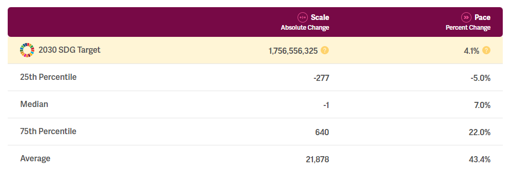 - Pace of change (percent): This reflects the year-on-year percent change in an impact result. Scale of change as a percent is calculated using unweighted impact results, given the inherent nature of percentages. For example, if an investee has 10,000 active clients in 2020 and 8,000 active clients in 2019, then the scale of change as a percent would be 0.25, or a 25% year-on-year increase in active clients.