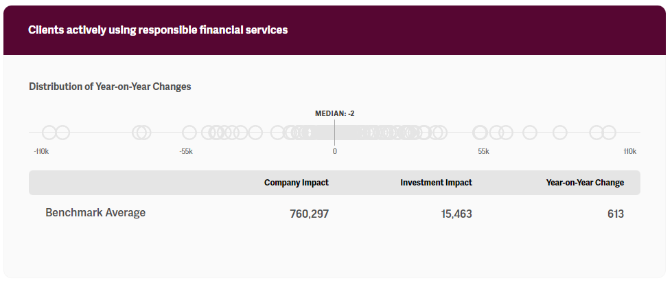 Below is a preview of the key performance indicator (KPI) of "clients actively using responsible financial services." The full benchmark includes including six additional KPIs. All KPIs include additional information related to product / service features, market segmentation, investor contribution, and performance over time.