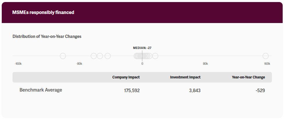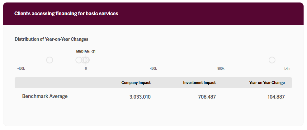 The primary purpose of the impact performance benchmark is to enable investors to compare impact performance relative to peer groups and the pace of change needed to achieve financial inclusion globally. For this reason, the KPIs presented in the benchmark are relevant for comparative purposes. Naturally, investors will also rely on additional metrics for their own impact performance management internally. This can include interest rates, average loan size, and product affordability, among others — all of which are critical in assessing impact performance internally but are not suitable for aggregate comparisons given the context needed to appropriately interpret each. For a full suite of metrics that investors may track, please see the IRIS+ framework builder financial inclusion theme here. Additionally, investors may leverage qualitative insights and anecdotes to support and supplement quantitative impact analysis.